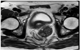 患者遂于2018年6月11日行肝左外叶切除术。术后病理符合直肠癌肝转移。术后患者恢复顺利,经与肿瘤科商议,在2018年7月2日至2018年11月9日予以奥沙利铂+卡培他滨化疗6次。随后定期随访,患者似乎对癌胚抗原指标较敏感,所以重点关注了此项指标。CEA分别为2.33 ng/ml (2018年7月3日)、4.54 ng/ml (2018年10月8日)、15.66 ng/ml (2018年11月12日,肝转移切除术后5个月)。此时患者出现癌胚抗原指标升高,完善胸部、全腹部增强CT未见转移征象,建议患者行PET-CT检查。但患者因经济因素拒绝,遂嘱其3个月后再次复查。患者因个人因素于8个月后来院检查,癌胚抗原为3.35 ng/ml (2019年6月11日,肝转移切除术后1年),胸腹部CT未见转移征象。患者1年后主诉会阴部疼痛、坠胀,完善癌胚抗原为9.9 ng/ml (2020年7月14日,直肠癌术后近7年,肝转移切除术后2年),完善盆腔MR检查(图4、图5)示尾骨前肿块,考虑转移性病灶,侵及左侧精囊腺、前列腺可能性大(2020年7月14日)。