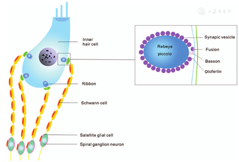 Cochlear ribbon synapses are those between the inner hair cell (IHC) and the terminal swelling of the afferent fiber of SGNs (Fig. 1). Each IHC contacts with 10 to 20 nerve terminals. Cochlear ribbon synaptic pairs consist of pre-synaptic ribbons that are located near the membrane of IHCs, and post-synaptic α-amino-3-hydroxy-5-methyl-4-isoxazolepropionic acid glutamate receptors are located at the nerve terminal.