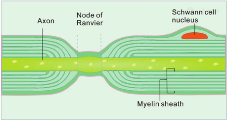 Type-I ANFs are myelinated projections covered by Schwann cells that have type-I SGN terminals that are covered by satellite glial cells. The unmyelinated portion of ANFs, between two Schwann cells, is connected by the nodes of Ranvier (Fig. 2). The nodes of Ranvier are completely separated from each other and rich in ion channels that are responsible for the rapid and efficient propagation of APs.[19,20,21] The myelinating glial cells, which are Schwann cells in the auditory system, engage in complex interactions with axonal segments and Schwann cells wrap around the axonal segments leaving the axolemma relatively uncovered at the regularly spaced nodes of Ranvier.[22]