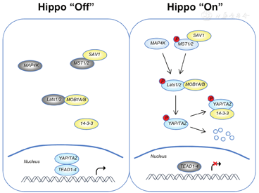 In PDAC, mutated Kras upregulates many genes that also affect the activity of the Hippo pathway. Two of these upregulated genes, eukaryotic translation initiation factor 5A (eIF5A) and pseudopodium enriched atypical kinase 1 (PEAK1), drive PDAC pathogenesis by the RhoA/ROCK signaling and inhibiting YAP/TAZ activity via mediation with stem cell-related transcription factor Oct4, Nanog, Myc, and TEAD.[51,52]