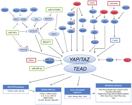 Stem cell-related transcription factor Oct4, Nanog, Myc are reported being involved in the eIF5A/PEAK1 signaling regulation of YAP/TAZ activity.[52] When Yap ablation triggers metabolic stress via the downregulation of Myc, the upregulation of Sox2 compensates for Yap loss via the restoration of Myc and DNA demethylation.[47] In cooperation with Myc, Yap/Tead complex maintains the metabolic homeostasis in PDAC with Kras-mutant via regulating genes regulate glycolysis, glutamine metabolism, serine/folate/glycine metabolism, de novo nucleotide synthesis, and nucleotide salvage.[47]
