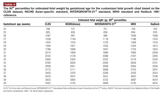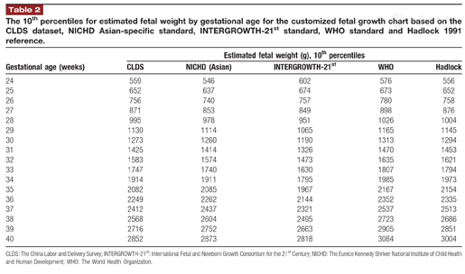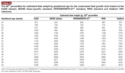 Collectively, it is imprecise to simply apply these existing standards or references to the Chinese population. Using country as a proxy for the local ethnic mix has been found to be much more important than other variables.26 Given these discrepancies between the study population in the universal standards and our own population, we suggest that a national fetal growth standard may be constructed for local use.