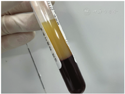 In a regular prenatal checkup at 30 weeks of gestation, a fasting blood specimen indicated elevated TC and TG. A severe hypertriglyceridemia to 64.62 mmol/L (normal value <2.28 mmol/L) and a severe hypercholesterolemia 20.16 mmol/L (normal value <5.16 mmol/L) were found (Fig. 2). She was asymptomatic clinically, and the physical examination did not reveal any stigmata associated with elevated TGs or TCs. All she complained about was slightly dizzy in her head this time. Her abdomen was supple, with no tenderness and rebound tenderness; the liver and spleen were impalpable; no contractions were noticed; her weight has increased to 83 kg with a height of 163 cm. Serum analysis revealed normal glucose, blood routine examination, amylase, lipase, and thyroid-stimulating hormone. Electrocardiograph and head magnetic resonance imaging are also negative. Urea, electrolytes, renal, liver, and coagulation function tests were all normal. An abdominal ultrasound scan revealed slight fatty liver, while echocardiography was negative as well as obstetric ultrasound. Once more like old times, she was started on a low-fat (<20% of calories), low-carbohydrate diet and given education by a nutritionist. Besides what we mentioned previously, she was also treated with an insulin drip daily. A lipid panel 2 weeks later revealed a fasting TG level of 38.82 mmol/L and TC level of 14.12 mmol/L. The patient was discharged home on TG being 15.97 mmol/L and TC level of 7.45 mmol/L after 18 days. At 36 weeks of gestation, this patient was found to have a blood pressure of 150/100 mm Hg on labetalol 50 mg every 8 hours and her fasting laboratory results revealed TC level of 14.63 mmol/L and TG level of 48.40 mmol/L, which introduced her to present in the hospital again. She was again started with insulin drip and her lipid profile had considerably improved: TG level of 27.71 mmol/L and TC level of 12.74 mmol/L while her blood pressure was fluctuating on 140/90 mm Hg. This patient delivered through the cesarean section with fasting blood glucose being 5.1 mmol/L. A female infant weighing 3530 g with Apgar point of 10-10-10 at 1, 5, and 10 minutes, respectively. On the first day after delivery, her laboratory results showed that her level of TG was reduced to 22.22 mmol/L and TC was 12.23 mmol/L. She was discharged home with fenofibrates for lipids and labetalol for blood pressure.