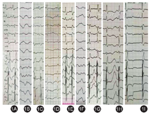 偏振光近红外线照射治疗前后的心电图QTc、QT间期的变异性(QTd)、Tpeak-Tend结果显示治疗后交感神经兴奋性降低,详见表1。5 h后停止艾司洛尔微量泵入,复查电解质示血清钾3.62 mmol/L,心电监测显示为窦性心律电风暴未再发作。继续给予利尿、扩血管、强心、补钾等治疗,患者未再出现室速、室颤。电风暴18 d后复查,血清钾4.2 mmol/L,BNP 130 pg/ml,好转出院。随访1个月,患者无心悸、喘憋等不适。复查BNP 427 pg/ml,心电图(图1I)示窦性心律,心室率80次/min,无室性心律失常发作。