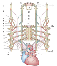 注:图中1为颈上神经节,2为心上神经,3为颈中神经节,4为心中神经,5为椎旁神经节,6为锁骨下袢,7为星状神经节,8为胸1神经,9为心下神经,10为胸迷走神经心支,11为第2胸交感神经节,12为白交通支,13为灰交通支,14为胸椎旁交感神经纤维心支,15为第4胸交感神经心支,16为迷走神经背核,17为孤束核,18为延髓,19为迷走神经,20为颈上心迷走神经,21为颈下心迷走神经,22为上行联接,23为心神经丛。图中剪刀显示心脏去交感神经术中交感神经链切除部位;此图显示支配心脏的交感神经包括心上神经、心中神经、心下神经及胸心神经;其中,心上、中、下神经分别由颈上、中、下神经节发出,而颈上、颈中神经节均来源于颈下神经节,即星状神经节