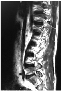 注:L1椎体变扁;T11~T12、L2~T3椎体不同程度双凹变形,其内可见长T1短T2信号,脂肪抑制序列呈高信号;各椎体信号普遍偏低;椎间盘未见异常;脊髓圆锥内未见异常信号影;椎旁软组织无明显肿胀