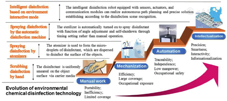 The prevention and control of hospital-acquired infections is the cornerstone of medical safety and a core task in improving medical service quality. The integration of engineering technology and hospital infection management has resulted in breakthroughs in infection control technology. Medical institutions worldwide are optimizing hospital intelligence and collecting and organizing information from various perspectives, building innovative models of hospital development. These models help achieve cost reductions associated with hospital infection prevention and control. Institutions are applying advanced biomedical engineering technology to allow patients to interact with medical staff, medical institutions, and medical equipment and achieve greater informatization and intelligentization. Historically, disinfection practices have become less manual, more mechanized and automated, and finally intellectualized (Figure 1). For hospital infection control, each step of development relies on innovation in engineering technology. During major infectious disease outbreaks, the integration of technological engineering and hospital infection management has played a central role.