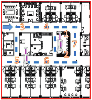 Throughout the COVID-19 pandemic, our team used intelligent disinfection robots to automate disinfection in admission areas. We also performed experiments to evaluate the effectiveness of robotic disinfection. From April 1 to 5, 2020, we randomly selected two isolation wards at Wuhan Union Hospital West Campus that possessed identical building layouts for the hospitalization of patients with severe COVID-19 and used intelligent robots to perform automated environmental disinfection of contaminated areas for three consecutive days. The air and surfaces in the environment of the ward areas were sampled continuously at fixed times (15:00-16:00) every day before (day 0), during (days 1-3), and after (day 4) the disinfection project to monitor the total number of microbial colonies. The robot operated along regular operation routes and times in each isolation ward to control for confounding factors. A total of 70 specimens (ten air and 60 surfaces) were collected for bacterio-logical cultures. Figure 3 shows the operational path of the intelligent disinfection robots in the isolation ward area and the distribution of the sampling sites.
