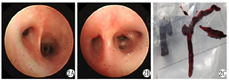 入院治疗:给予一级护理,血氧心电监护,测血压(右侧腘窝血压测不出),嘱卧床,抬高右下肢,局部保暖,给予美罗培南抗感染,阿司匹林肠溶片(国药准字:H13021127,石药集团中诺药业有限公司),25 mg/次,口服,1次/d、低分子肝素钙(国药准字:H20010300,海南通用同盟药业有限公司),100 IU/kg,肌肉注射,每12小时1次、前列地尔(国药准字:H20103101,西安力邦制药有限公司),1 ml,静脉注射,1次/d,抗凝改善循环,帕拉米韦(国药准字:H20130029,广州南新制药有限公司)抗病毒等治疗。入院第2天,患儿仍有反复发热,查体双眼结膜充血,换予美罗培南(国药准字:J20140170,Sumitomo Dainippon Pharma Co Ltd)联合替考拉宁(国药准字:H20093651,浙江海正药业股份有限公司)抗感染治疗,同时予静脉注射人免疫球蛋白(国药准字:S10970032,华兰生药工程股份有限公司),2 g/kg支持治疗。入院第3天患儿仍有反复发热,完善支气管镜检查及肺泡灌洗术,可见各支开口黏膜粗糙,少量稀白分泌物附着,右肺下叶分泌物较多,局部灌洗右肺下叶后可见较多稀白分泌物,管壁毛糙(图2A、图2B)。查下肢血管B超示右侧髂总动脉,髂内动脉起始段、髂外动脉、股总动脉、股浅动脉近心段、股深动脉起始段、腘动脉、胫前动脉、胫后动脉内径、肌间动脉、足背动脉管壁僵硬,管腔内均可见暗淡回声充填,血流信号缺失。全腹部CT示右髂血管密度增高,考虑闭塞性动脉炎。予全身麻醉下行股动脉切开取栓术,分别于股动脉远端、股动脉近端、股深动脉远近端取出长度分别为5.0、4.0、0.5、0.5 cm的血栓(图2C)。入院第4天,患儿体温逐渐正常,右下肢疼痛好转,查体:右小腿中远端及足部皮温暖,可触及明显足背动脉搏动,右足趾甲红润,充血试验正常,复查双下肢血管B超右侧动脉取栓术后,右侧髂总动脉内中膜略厚,回声稍强,右侧股浅、腘、胫前动脉峰值流速较对侧略低,余未见异常。入院第6天,患儿再次出现发热,头痛,具体性质不详,可耐受,伴嗜睡,仍有咳嗽咳痰,复查D-二聚体8.79 mg/L,血清铁蛋白708.25 μg/L,ESR 41 mm/h;复查胸部CT示大叶性肺炎并大量胸腔积液,胸部B超示双侧胸腔积液(右侧大量,左侧少量),胸腔积液常规、生化、染色、培养未见明显异常。肺泡灌洗液培养示革兰阳性球菌,400 cfu/ml。头颅MRI示右侧乙状窦显影浅淡,MRV颈内静脉未见明确显示,考虑血栓可能,脑实质未见异常(图3A、图3B)。脑脊液常规、生化、染色、培养未见异常。换予亚胺培南西司他丁(国药准字:H20084018,珠海联邦制药股份有限公司)联合阿奇霉素(国药准字:H2000426,东北制药集团沈阳第一制药有限公司)序贯治疗,抗感染,布地奈德(国药准字:H20140474,AstraZeneca Pty Ltd)、异丙托溴铵(国药准字:H20150173,SCS Boehringer Ingelheim Comm.V)联合沙丁胺醇(国药准字:H20160660,GlaxoSmithKline Australia Pty Ltd.)雾化止咳化痰,前列地尔抗凝,贝前列素钠(国药准字:H20083589,北京泰德制药股份有限公司)抗血小板,醋酸泼尼松片(国药准字:H33021207,浙江仙琚制药股份有限公司),10 mg/次,口服,3次/d抗炎,合并中药综合治疗。入院第13天,患儿体温正常,精神好转,咳嗽咳痰较前减轻,复查D-二聚体13.11 mg/L,凝血:纤维蛋白原5.73 g/L,加低分子肝素钙抗凝。入院第21天,复查胸部B超示未见胸腔积液,予醋酸泼尼松片逐渐减量至停药。共住院22 d,病情平稳出院。