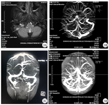 入院后给予一级护理,低流量鼻导管吸氧,亚胺培南西司他丁联合红霉素(大连美罗大药厂,国药准字:H21021678)抗感染,盐酸氨溴索(Boehringer Ingelheim Pharma GmbH & Co.KG,国药准字:J20140032)化痰,布地奈德、异丙托溴铵联合沙丁胺醇雾化止咳化痰,甲泼尼龙琥珀酸钠(国药准字:H20170197,甲泼尼龙琥珀酸钠)抗炎,多烯磷脂酰胆碱(成都天台山制药有限公司,国药准字:H20057684)保肝,更昔洛韦(湖北科盖药业股份有限公司,国药准字:H10981089)抗病毒治疗。入院第7天患儿体温正常,咳嗽咳痰减轻,精神仍稍差,偶有头痛,具体性质不详,可耐受。复查血常规:WBC 14.21×10 9/L,N% 70.2%,RBC 3.93×1012/L,Hb 11 g/L,PLT 360×109/L。尿常规正常。CRP 0.81 mg/L。ESR 63 mm/h。复查胸部CT示肺炎病灶较前吸收不明显,胸部B超示左侧胸腔积液(微量),完善支气管镜及肺泡灌洗术,镜检可见左肺各支开口黏膜粗糙,少量稀白分泌物附着,右肺开口处黏膜粗糙,红肿,右肺中叶分泌物较多,局部灌洗右肺中下叶后可见较多稀白分泌物。肺泡灌洗液培养示革兰阳性球菌,偶见,白细胞(+++)。脑脊液细胞学常规、生化、染色、培养均正常。头颅CT示右侧横窦走行区局部密度增高,大脑脑沟增宽。头颅MRI/MRV/MRA示右侧颈内静脉、乙状窦及横窦走行区信号增高,MRV示右侧颈内静脉、乙状窦及横窦走行区显影欠佳,考虑血栓形成可能,MRA未见明细异常(图4)。心脏B超未见异常。换予拉氧头孢(国药准字:H10930215,海南海灵化学制药有限公司)抗感染,口服醋酸泼尼松片抗炎,加予胞磷胆碱钠(国药准字:H19993061,山东新体制药股份有限公司)营养神经,右旋糖酐40葡萄糖(国药准字:H51020230,四川科伦药业股份有限公司)抗血栓,低分子肝素钙抗凝治疗。入院第30天复查头颅MRI示右侧颈内静脉、乙状窦及横窦走行区异常信号消失,MRV示右侧颈内静脉、乙状窦及横窦显影欠佳,右侧横窦显影较前增粗。共住院36 d,患儿体温正常,无咳嗽咳痰,神清精神可,无特殊不适出院。
