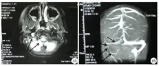 MPP并发CVST早期影像学也可以表现为弥散性或局灶性脑水肿、脑梗死及脑出血等表现。目前,头颅CT(CTV)、MRI(MRV)和数字减影血管造影(DSA)都可以用来诊断CVST。通常,头颅MRI对诊断颅内血栓有重要意义[8],能较快确诊。相比之下,CTV和MRV能提供更可靠的依据[40]。本资料2例患儿均通过头颅MRI(MRV)检查诊断CVST。由于SMPP患儿感染程度较重,可伴有精神差等表现,可能掩盖并发CVST的一些症状,同时需与MP引起的脑炎相鉴别,2例患儿均经神经查体无阳性体征,脑脊液检查均正常。因此,对于存在多个危险因素或有CVST高度风险因子的MPP患儿应及早行MRI检查。考虑经济原因,也可在发病通过头颅CT协助诊断,后期复查头颅MRI判断疗效。