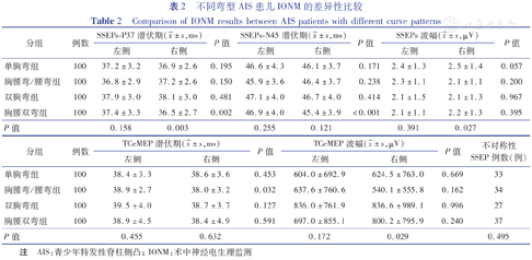 AIS患儿矫形术中双下肢SSEP和TCeMEP的潜伏期和波幅存在不对称现象。弯型不是AIS患儿矫形术中不对称性SSEP的风险因素。