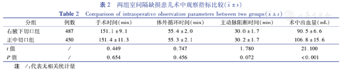 右腋下切口组和正中切口组手术时间、体外循环时间、主动脉阻断时间相比,差异均无统计学意义(P>0.05);右腋下切口组术中出血量少于正中切口组,差异有统计学意义(P<0.05)。见表2。