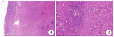 注 A:可见散在脾小体样结构(HE染色;×100); B:间质内较多淋巴细胞及散在少量中性粒细胞浸润及含铁血黄素沉积,被膜下炎性肉芽组织增生伴大量急慢性炎症细胞浸润,部分区域伴纤维母/肌纤维母细胞增生(HE染色;×400)