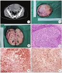 病理所见:肿瘤呈团巢及腺样排列,肿瘤细胞中等大小,胞质少或淡染,胞核小,卵圆形,核分裂易见。免疫组织化学染色:CK-pan、CR、Vim、CD99、Melan-A、Ki-67(70%)、CD117、a-inhibin、WT-1均阳性,OCT4、SALL4、PLAP均阴性,考虑中-低分化Sertoli细胞瘤(图3)。