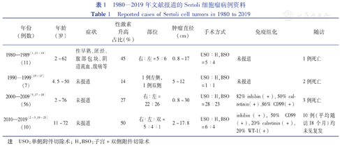 Sertoli细胞瘤是Sertoli-间质细胞瘤中的一种罕见情况,国外共报道一百余例,我国可查到的病例仅有十余例。查阅国内外文献,1980—2019年Sertoli细胞瘤情况见表1。该肿瘤发病年龄在2~79岁之间,多于早期发病,平均发病年龄在30岁左右[1,2,3]。而本病例发病年龄不到1岁,国内外文献均无报道。有一半的肿瘤可有激素分泌功能,多为雌激素分泌型,少数为雄激素分泌型,两者兼有的情况罕见。雌激素分泌型主要表现为女性化特征明显(临床表现为假性性早熟、阴蒂肥大、月经过多等),雄激素分泌型主要表现为闭经、多毛、乳腺萎缩等。血清学检查可见雌激素、孕激素、黄体生成素或雄激素水平升高,部分患者可伴有Peutz-Jeghers综合征。