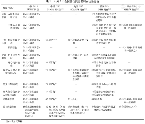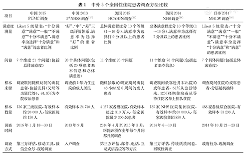 | 项目 | 中国2015 PUMC调查 | 中国2013 5thNHSS调查[17] | 美国2015 HCAHPS调查[20] | 英国2014 NHS调查[18] | 日本2014 MHLW调查[19] |