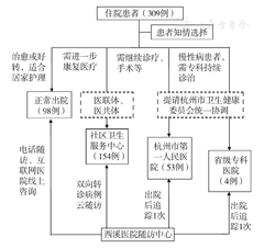 2020年1月22日,西溪医院接到浙江省和杭州市卫生健康委员会下达的诊治新冠肺炎患者定点医院的任务。此时,医院尚有住院患者309例。医院迅速启动在院患者疏散应急预案,由各科室医疗组长评估患者病情,并结合浙江省医联体和医共体建设现状[3,4],进行分类疏散,疏散去向如图1所示。我们将患者分为4类进行疏散,并交由医院随访中心进行追踪随访。