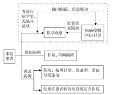 密切结合国家对于疫情防控的升级措施,结合浙江省各级防疫文件,通过流行病学史与患者症状体征等进行入院的全面筛查和评估,流行病学史根据浙江省与国家的实时动态进行调整。所有患者根据评估结果进行分层管理,分层脉络如图3所示。对疑似病例和确诊病例完全按照诊疗方案要求进行管理。为了尽可能识别出可能患病的人群,对于有流行病学史但尚无任何症状的人群,通过辖区疾病控制中心联动社区进行跟踪管理,便于该类患者一旦出现症状及时就诊。
