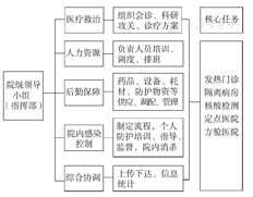 (2)探索纵横交错的管理模式:武汉协和医院2所分院被确定为重症患者定点救治医院,江汉方舱医院整体交医院托管。为提高效率,我们探索了"纵横交错"的管理模式。纵向:在院级指挥部的领导下,分别指定1名副院级领导各自负责院本部、分院、方舱医院管理,并抽调行政管理干部充实组建管理团队,分别与上级指挥部直接联系,报送医疗数据、物资配给需求,寻求所在辖区政府的配合支持,形成纵向高效管理体系;横向:由院本部6个工作组协助开展工作,尤其是人员调配和后勤物资保障等,形成横向联通协同的管理体系。