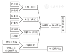 武汉同济医院已经建设基于云的一体化平台并运行良好[6]。我们首先确定方舱医院由A、B 2个馆组成,因此可以将整个方舱设置为2个病房,每个病房可按照病床的摆放设置若干护理单元。每个病房在洁净区设置1个医生工作站,在污染区设置若干个护士工作站,同时在患者入口处设置入院室,在医技区设置药房、放射、财务、管理等科室。这样,将每个站点的网点通过网络设备快速形成一个医院的局域网,具体网点数量根据需要布点,尽量做到患者入住后不进入方舱施工。然后,通过租用的网络直接接入同济医院业务网络,形成基于同济云平台的网络部署架构。管理部门如果需要业务外网,可通过4G网络形成快速部署,如图1所示。