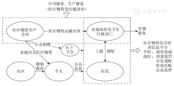 笔者从应急医疗物资生产、运输、储备、调配、监管五个方面,对政府、社会、企业、民众广泛参与共建的应急医疗物资保障体系的路径和方法进行探讨(图2)。在科学确定储备物资品种和数量的基础上,构建以政府储备为核心、社会力量储备为补充、家庭储备为前端、生产企业提供代储的多元化、多层次应急物资储备网络。政府及卫生行政部门在扩大应急医疗物资实物储备的基础上,要与医疗物资生产企业、运输企业建立合同储备及生产储备机制,制定医疗物资生产企业及运输企业的供应链清单,确保突发公共卫生事件发生时物资的稳定供应。此外,政府要发挥行政指导职能,引入社会资本,指导建立医疗物资综合管理信息平台,通过智能化手段提高物资调配能力;医院要利用好该平台,及时上报物资储备及使用情况,以提高物资调配的及时性和精准性;公众可对该平台物资的运输调配进行监督,提高应急医疗物资分配及使用的透明度。最后,社区作为"第一道防线",要对居民加强传染病防控的健康宣教,提高居民的医疗物资储备意识和传染病防范能力。