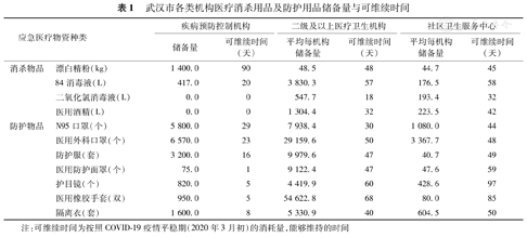 (二)不同类型机构的应急医疗物资"平时"储备量存在差异。本研究对武汉市疾病预防控制机构、59所二级及以上医疗卫生机构、133家社区卫生服务中心应急消杀用品以及防护用品"平时"储备情况进行数据收集和问卷调查(表1)。结果显示,按照COVID-19疫情平稳期(2020年3月初)的消耗量,二级及以上医疗卫生机构以及社区卫生服务中心应急消耗性物资储备量较为充足,物资最短可维续时间分别为18天和32天;而疾病预防控制机构作为突发公共卫生事件应急管理的主要单位,其应急消耗性物资储备较为不足,其中二氧化氯消毒液以及医用酒精储备量可维续天数仅0天,多种防护用品可维续时间不足1周。此外,由于COVID-19属于新发传染病,其传染性较强、波及面广[7],疫情早期预警、评估和反应速度慢使得感染人数迅速增加,导致日常储备的医疗物资数量难以满足疫情防控的需要。而二级以上医疗卫生机构以及社区卫生服务中心作为收治COVID-19患者的"主战场"和"第一道防线",虽然其应急消耗性物资储备可维续时间较长,但在疫情暴发初期也难以支撑迅速增长的消耗量,造成了疫情初期医疗应急物资紧缺的局面[8]。
