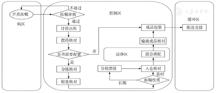 (一)制定"一审五核对"的节点控制流程。我院药学部迅速调研并将医院信息系统中的药房工作站和护士工作站临时组合,对临时医嘱与长期医嘱人工分批次计价,制定了静脉用药集中调配模式下"一审五核对"的节点控制流程。具体如下:医生开立医嘱,系统自动审查用药医嘱合理性及安全性,发现异常医嘱,及时提醒审方药师进行人工审查和干预;确认医嘱的合理性之后,从药师开始调配药品到病区患者输液之前,一共经过五道核对,分别是摆药核对、分拣核对、贴签核对、入仓核对、输液成品出仓核对,分拣打包、输液配送,层层严格把关,确保每一袋输液的质量安全。见图1。