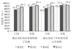 本研究聚焦患者调查问卷中"我认为医改让患者得到了实惠""我认为近3年医患关系正在好转""我认为医务人员值得社会的认同与尊重"和"我愿意让我的子女从事医务工作"4项指标。一方面通过分析患者对上述条目满意度/认可度的变化趋势,探讨患者视角下的医改成效和对医务人员职业认同的改善;另一方面通过与就医体验总体满意度(即"总体上我对本次就诊/住院服务满意"条目的认同度)的相关分析,探讨患者对医改成效及对医务人员职业认同的主观感受与就医体验之间的关系。