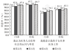 患者是否愿意让子女从医的调查结果与上述指标的变化趋势一致。第5次评估中门诊患者愿意让子女从医的比例较第2次评估提高8.1个百分点;有别于门诊患者的连续提升,第3~4次评估中持认同态度的住院患者比例相对平稳,第5次评估提高幅度较大,这可能与疫情过程中患者对医务人员勇于担当、忘我奉献的认同和感动有关(图2)。