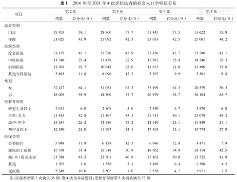 患者人口社会学特征分布见表1。纳入研究的门诊患者共计120 632例,住院患者90 211例,除患者自报没有医疗保险的比例呈下降趋势外(由第2次调查的10.6%降至第5次调查的3.5%),其余分布特征基本保持一致。