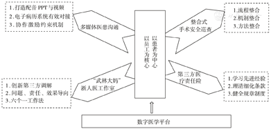 平安医院建设的两大重点是医疗质量安全与医患关系。为达到严格保证医疗质量安全与有效构建和谐医患关系的目的,浙人医提出"两心四翼"的平安医院创新策略,其中"两心"指以患者为中心、以员工为核心,"四翼"包括多媒体医患沟通、"武林大妈"工作室、整合式手术安全巡查和第三方医疗责任险(图1)。医院制定精细化的操作路径,形成医疗安全管理创新包,并以数字化为支撑,打造平安医院管理的驾驶舱,各单元协同联动,高效运作。