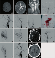 患者男,72岁。因"突发言语不清伴左侧肢体活动不灵4 h"于2019年12月入院。既往高血压病史9年,收缩压最高为190 mmHg(1 mmHg=0.133 kPa),未规律口服降压药,血压控制差;鼻咽癌病史20余年,多次行放射治疗。入院查体:血压120/60 mmHg,美国国立研究院卒中量表评分(NIHSS)12分,格拉斯哥昏迷评分(GCS)13分,改良Rankin量表评分(mRS)4分。意识清楚,精神差,语言含糊不清,回答欠合作;双眼向右侧凝视,双侧瞳孔等大、等圆(直径约3 mm),对光反射迟钝;鼻唇沟对称,口角相等,伸舌居中;双侧肢体肌张力正常,左侧肢体肌力0级,右侧肢体肌力Ⅴ级;左侧巴宾斯基征(+),右侧(-)。急诊头颅CT提示"未见明显异常",考虑急性脑梗死,给予阿替普酶(63 mg)静脉溶栓,症状未见明显好转,急诊行头颅MRI+MR血管成像(MRA)提示:右侧基底核、额顶叶散在急性梗死,右侧颈内动脉及MCA栓塞(图1A~C)。当日在气管插管全身麻醉下行脑血管造影+右侧颈内动脉球囊扩张+右侧MCA取栓+右侧颈内动脉支架置入术,术中造影见右颈内动脉起始段闭塞(图1D),更换8F导引导管(美国强生公司)置于右侧颈总动脉远端,泥鳅导丝缓慢通过闭塞段,撤出导丝后造影见对比剂缓慢显影至右侧颈内动脉末端,大脑前动脉显影,MCA闭塞不显影(图1 E)。依次用MINI TREK球囊(美国Abbott公司)、Viatrac 14 Plus球囊(美国Abbott公司)扩张右侧颈内动脉近段(图1 F)。将5F Navien导管(美国eV3公司)置于颈内动脉床突段,Rebar-18微导管(美国eV3公司)在Avigo微导丝(美国eV3公司)的引导下置于右MCA上干,手推对比剂显示MCA上干显影,Solitaire FR支架(美国eV3公司)取栓并抽吸Navien导管,见有少量栓子取出,复查造影见右MCA不显影(图1G),相同方法再次取栓抽吸见有暗红色栓子取出(图1H),复查造影显示右侧MCA及各分支显影良好,右MCA血流达血流灌注(TICI)分级3级(图1I,J),Dyna CT显示右侧基底核区对比剂外渗(图1K)。开通血管约1 h后再次复查右颈总动脉造影,见右颈内动脉近段血流明显减慢,考虑血流不能维持(图1L,M)。于Navien导管内缓慢推入0.25 mg替罗非班,外周静脉以0.25 mg/h泵入替罗非班,在Spider FX保护伞(美国Ev3公司)的保护下顺利置入RX Acculink(美国eV3公司)支架并释放,造影见右颈内动脉起始段狭窄明显改善,远端大脑前动脉、MCA及各分支显影良好(图1N)。术后给予替罗非班(0.25 mg/h)持续泵入24 h,术后第2天复查头颅CT未见明显出血(图1O),给予阿司匹林100 mg(1次/d)+氯吡格雷75 mg(1次/d),调控血压维持在低于平时血压20 mmHg,并给予甘露醇、依达拉奉等药物防治脑缺血再灌注损伤,患者症状好转,NIHSS为3分。术后第9天NIHSS为0分,mRS为0分,神经系统查体未见明显阳性体征。