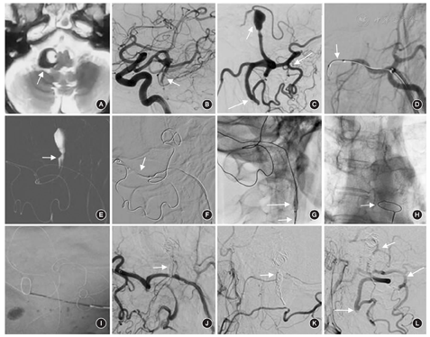 患者男,65岁,因"双眼视物模糊半年,加重1周"为主诉入院。外院行MRI可见右侧延髓旁血管流空影,考虑为椎动脉动脉瘤(图1A)。此次入院后行全脑DSA显示,双侧椎动脉自起始段闭塞,V3段至椎动脉颅内段由双侧颈外动脉通过枕动脉代偿供血而显影,右侧椎动脉V4段可见一梭形动脉瘤,最大直径为14.3 mm,远端1 mm处可见椎动脉分支—小脑后下动脉(PICA)发出,其以远的椎动脉未见显影(图1B,图1C)。手术操作包括:(1)球囊闭塞试验:患者取仰卧位,在局部麻醉下行右侧股动脉穿刺,置入8F股动脉鞘,在泥鳅导丝的配合下同轴引入8F MPA指引导管(美国强生公司),头端置于右侧颈总动脉近分叉处,沿8F指引导管引入5F Navien导管(115 cm,美国美敦力公司),头端超选至右侧枕动脉上升段的末端,行DSA进一步明确动脉瘤的解剖结构。在10系ASAHI微导丝的配合下引入高顺应性球囊(HyperForm,3 mm×7 mm,美国美敦力公司),缓慢给予压力充盈,DSA提示右侧枕动脉的血流完全阻断,球囊以远的枕动脉及代偿的椎动脉、动脉瘤均未见显影(图1D),持续闭塞35 min,观察患者无头晕、呼吸困难、肢体运动、感觉及言语障碍等脑缺血相关症状后,撤出球囊。(2)颅内动脉瘤的栓塞:患者予全身麻醉,在工作角度路图下,微导丝配合Headway Duo微导管(156 cm,美国Microvention公司)超选至迂曲的吻合支,头端置于右侧椎动脉V4段动脉瘤的近端(图1E),撤出微导丝,引入首枚Axium弹簧圈(14 mm×30 cm,美国美敦力公司),待填塞入动脉瘤瘤腔约1/2长度的弹簧圈时,因弹簧圈的推送困难,遂撤出更换为MicroPlex弹簧圈(8 mm×20 cm,美国Microvention公司),同样在填塞约弹簧圈的1/2长度时无法继续推送,多次尝试失败后,缓慢回撤推送杆使弹簧圈末端自动解脱。然后继续将弹簧圈推送杆进一步向前推送时,发现弹簧圈的中间部分解旋。(3)弹簧圈解旋的处理:①首先尝试缓慢回撤微导管,发现部分填塞的弹簧圈自动脉瘤瘤腔退出,然后采用14系微导丝经微导管内向前推送弹簧圈末端,同样推送困难,效果不佳。②在微导丝的配合下,沿5F Navien导管引入SV球囊(3 mm×15 mm,美国波士顿科学公司)至中间导管的头端(图1F),缓慢充盈球囊使其紧贴支撑导管的内壁。通过球囊-Headway Duo微导管-Navien支撑导管三者之间的相互作用力,缓慢回撤整个系统,通过DSA可观察到弹簧圈随上述系统向近端移动(图1G)。完全撤出中间导管、微导管,可见弹簧圈尾端滞留于右侧颈总动脉内。③沿8F指引导管引入直径为10 mm的鹅颈抓捕器(美国美敦力公司),头端至目标位置后,打开抓捕器,旋转并套取解旋的弹簧圈,将8F指引导管前推,收紧抓捕器,抓取成功后,将弹簧圈完全撤出(图1H,图1I)。④在微导丝的配合下引入另一根Headway Duo微导管,再次通过迂曲的吻合支,头端置于右侧椎动脉V4段的动脉瘤瘤腔内,引入Axium弹簧圈(9 mm×30 cm,美国美敦力公司),填塞部分后依然推送困难,遂缓慢继续填塞,然后引入规格为8 mm×30 cm的Axium弹簧圈,填塞过程中微导管头端明显后退,填塞接近尾端时发现弹簧圈自动解脱(第1枚弹簧圈主要分布于动脉瘤瘤腔,第2枚弹簧圈闭塞椎动脉V4段的近端)。行DSA可见载瘤血管的近端及动脉瘤完全不显影(图1J),对侧颈外动脉造影可见枕动脉-椎动脉代偿的PICA显影,术后患者无明显不适,5 d后出院。术后8个月复查DSA显示,动脉瘤和右侧椎动脉均未显影,可见对侧枕动脉通过吻合支代偿椎动脉(图1K,图1L)。
