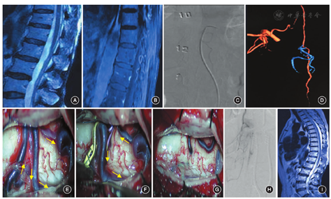 患者女,64岁。因"左侧臀部、下肢疼痛及麻木1年,加重伴行走困难1个月"入院。自诉疼痛呈"放电样",在触摸左侧大腿内侧时可引发疼痛,活动或劳累后加重,持续数分钟,休息后可自行缓解,无肢体乏力、括约肌功能障碍等症状。外院曾诊断为"腰椎间盘突出",给予对症治疗和理疗后效果差。患者1个月前疼痛症状加重,不能行走。入院查体:四肢肌力、肌张力正常,深、浅反射和感觉正常,括约肌功能正常。肌电图检查未见明显异常。行腰椎MRI检查(图1A,图1B):T2加权成像上T11水平可见点灶样高信号,脊髓水肿不明显,未见明显的流空信号;强化后可见相同部位有增粗的血管影,部分位于髓内或位于脊髓背侧面,其节段局限,远端向下走行,向椎管外引流。脊髓血管造影检查(图1C,图1D):左侧T10肋间动脉发出前根髓动脉后,在T8下缘水平加入脊髓前动脉,其向下走行至T11水平发出穿动脉并形成瘘口。瘘口以远为静脉穿行于脊髓内并从脊髓背侧穿出,在脊髓背侧表面异常增粗成袢,向下、外侧走行,于左侧L1水平经硬膜穿出椎管。注入对比剂后,静脉在11 s时才开始显影,明显晚于常见的动静脉瘘造影时静脉显影的时间。手术于复合手术室实施,首先在左侧股动脉置入长鞘,无菌敷料保护穿刺点,患者取俯卧位,行后正中入路神经根减压术。术中打开硬脊膜后,可见脊髓背侧异常增粗的引流静脉(图1E~G),在神经根起始处穿行并卡压神经根,神经根表面的血管迂曲扩张,呈现"串珠样"改变。术中造影发现静脉显影时间比术前造影明显延迟,注入对比剂后至22 s引流静脉才缓慢显影,考虑为术中采用俯卧位、腹腔压力增高、静脉高压逆向传导至根静脉所致。同时,术中美兰造影确认责任血管无误后(图1H),将此迂曲扩张的静脉电灼并切除,从而达到神经根减压的效果。由于术中对位于腹侧的髓周动静脉瘘显露困难,故未予进一步处理。术后第1天患者主诉疼痛消失,无新增神经功能障碍。复查腰椎CT可见部分残留的静脉显影。术后3个月复查腰椎MRI,脊髓未见明显异常(图1I),出院后6个月随访患者未再出现神经根疼痛症状,且无新增神经功能障碍。