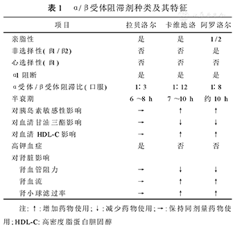 是一种具有特殊化学结构的单一化合物性质的药物,可同时选择性阻滞α1受体,非选择性阻滞β1和β2受体,即α/β受体阻滞剂。常用药物为卡维地洛、阿罗洛尔、拉贝洛尔。三者α受体和β受体阻滞作用的比例有所不同,而其各自的口服及静脉制剂间的阻滞比例同样存在差异(表1)。β受体阻断可使心率减慢、心输出量降低、心耗氧量降低致血压下降,而α受体阻断使外周血管阻力降低、冠脉阻力减小,同时,能激活脂蛋白酶活性来抵消β受体阻滞剂对它的抑制作用。因此,α/β受体阻滞剂在协同降压的同时,其不良反应可因同时存在另一受体的阻滞效应而减轻,使其既具有扩张血管、降低周围血管阻力、减少心搏出量、抑制肾素释放的作用,同时又具备抑制反射性心动过速、改善胰岛素抵抗、不加重脂代谢紊乱等优点[6,7]。