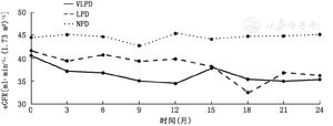 首先,低蛋白饮食治疗对于肾功能减退的延缓作用仍存在争议,目前关于低蛋白饮食对CKD患者肾功能影响的规模最大的临床实验,美国国立卫生研究院(NIH)进行的MDRD(1989—1993年)研究,其短期(2~3年)研究发现,对于中度肾病患者(GFR 25~55 ml/min),正常蛋白饮食(1.3 g·kg-1·d-1)组与低蛋白饮食组(0.58 g·kg-1·d-1)总的平均GFR下降率没有区别,但是,亚组分析显示低蛋白饮食能延缓GFR下降最快的CKD患者的GFR下降速度,并能减少尿蛋白的排出[8]。而且极低蛋白饮食(0.28 g·kg-1·d-1)不仅不能延缓肾功能衰竭的进展(87.3%比90.7%),还增加患者病死率及营养不良的发生率(38.9%比23.3%)[9]。