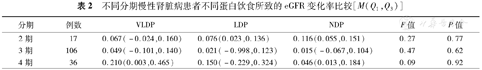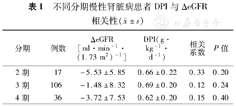 | 分期 | 例数 | ΔeGFR[ml·min-1·(1.73 m2)-1] | DPI(g·kg-1·d-1) | 相关系数 | P值 |