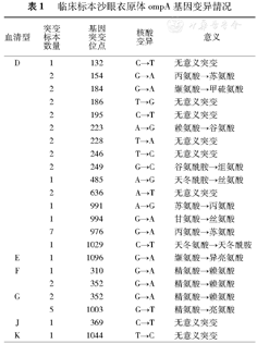 本研究对临床株沙眼衣原体ompA基因测序发现,血清型D型及G型存在碱基变异最多,而血清型E、F、J、K和H型ompA基因高度保守。但有报道显示在我国广州主要以血清型K型碱基变异最多,其次为血清型G型、E型[11]。陈丽丽等[12]报道显示血清型E、F型基因高度保守,与本研究结果一致。而在瑞典,最常见的碱基变异血清型为D型,其次为E型[13]。
