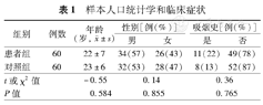 | 对照组 | 60 | 23±6 | 32(53) | 28(47) | 8(13) | 52(87) |