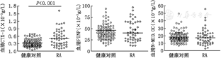 2010年4月至2012年12月在中山大学孙逸仙纪念医院采用电化学发光法检测51例确诊RA患者和102例健康对照者的血清骨代谢标志物I型前胶原氨基端前肽(PINP)、骨钙素降解产物(N-MID.OC)和I型胶原C末端肽(CTX-I)的水平并分析其与临床疾病活动指标的相关性。免疫组化染色检测30例活动期RA患者滑膜TRAF6表达,评估TRAF6+细胞数并分析其与骨代谢标志物之间的相关性。