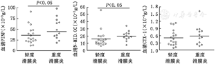 30例RA膝关节滑膜病理示衬里层细胞不同程度增生,衬里层增生程度积分0.5±0.5(中位数1.0),衬里下层炎症浸润程度积分1.3±0.5(中位数1.0),基质活化程度积分1.5±0.6(中位数1.0),总体Krenn's滑膜炎积分3.3±1.2(中位数3.0)。根据病理Krenn's滑膜炎积分,将30例RA分为轻度滑膜炎组(积分<4,n=18)和重度滑膜炎组(积分≥4,n=12)。血清骨形成标志物PINP和N-MID.OC水平在重度滑膜炎组高于轻度滑膜炎组(49.14±20.36比36.03±20.29 g/L;20.53±6.97比15.93±11.53 g/L,均P<0.05),而血清骨吸收标志物CTX-I水平在重度与轻度滑膜炎组间差异无统计学意义(图2)。血清PINP、N-MID.OC和CTX-I水平与Krenn's滑膜炎积分及衬里层增生、衬里下层炎症浸润、基质活化程度均无相关关系(均P>0.05)。