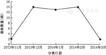 在45例纹带棒状杆菌分离患者中,男28例,女17例,平均年龄57岁(15~87岁),45例患者平均住院时间为9.5 d(6~38 d)。在分离出纹带棒状杆菌的同时或前1周内,这些患者使用或正在使用1种或多种抗菌药物,抗菌药物使用频次最高的为β内酰胺类抗生素,其次为喹诺酮类抗菌药物。2013年11月1日至2014年3月18日间纹带棒状杆菌月份分布呈现明显的聚集特征,见图1。