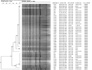 41株纹带棒状杆菌进行PFGE分型并做聚类分析,主要分离自神经外科病房、呼吸内科和ICU中,共分7个基因型。其中,神经外科病房20株,17株为0002型,1株为0003型,1株为0005型,1株为0006型;17株分别在2013年12月、2014年1月和2月有聚集分布情况,菌株检出时间重叠或先后出现。呼吸内科病房分离的8株菌中,分别有4株和3株归属于0006型和0002型,另外1株归属于0001型。ICU分离的8株菌中,各有3株菌归属于0002型和0006型,其他2株菌分布在其他2个基因型中。另外7株菌分离自其他几个病房,具体结果见图2。