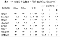 体外药敏试验发现,45株纹带棒状杆菌对青霉素、红霉素、四环素、环丙沙星、克林霉素5种抗菌药物的MIC90值均为64 μg/ml或>64 μg/ml;对庆大霉素、万古霉素和利福平的MIC90值均为0.5 μg/ml。具体结果见表1。
