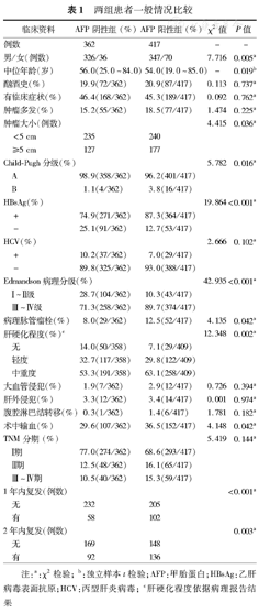 | 临床资料 | AFP阴性组 (%) | AFP阳性组 (%) | χ2值 | P值 | |