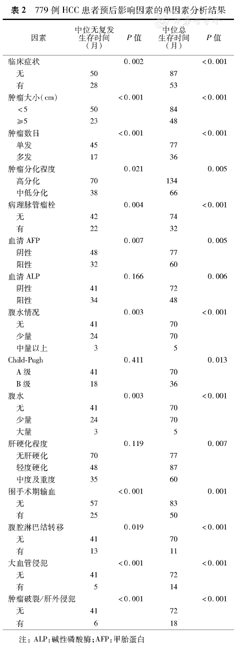 回顾性分析779例外科治疗HCC患者的临床资料,采用Kaplan-Meier法进行生存分析,应用Cox比例风险模型进行多因素回归分析。