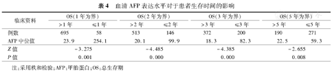 分别以阈值1、2、3、5年为界,将总病例分为生存时间大于阈值组及小于阈值组(表4),秩和检验结果表明:血清AFP低表达(18.3~23.9 μg/L)具有较好的预后,血清AFP>59.3 μg/L患者预后较差,AFP高表达与患者的不良预后相关。