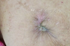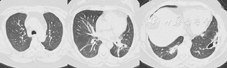 诊断肉芽肿性多血管炎(GPA),继发皮肤感染。予甲泼尼龙48 mg/d口服及复方环磷酰胺(CTX) 100 mg/d口服,后改为CTX隔日0.2 g静脉滴注治疗原发病,予哌拉西林/他唑巴坦+复方甲氧苄啶抗感染,皮下脓肿破溃处定期以抗生素软膏、外用重组牛碱性成纤维细胞生长因子(融合蛋白)及红汞纱条换药。经上述治疗,仍有发热,将抗生素调整为万古霉素、头孢他啶、氟康唑、磺胺,加用人丙种球蛋白10 g/d静脉滴注,共5 d,体温仍无好转,最高体温39.4 ℃,头痛加重,出现右侧额纹消失,鼻唇沟变浅,口角左偏,伸舌左偏,悬雍垂左偏,头颅MRI提示双侧硬脑膜增厚并明显强化(图3),多发颅神经受累(Ⅶ、Ⅷ、Ⅸ、Ⅹ),行腰穿及脑脊液检查未见异常,诊断肉芽肿性多血管炎(GPA)、肥厚性硬脑膜炎(HCP)、颅神经受累,予甲泼尼龙1 g/d静脉滴注冲击治疗3 d,后序贯为40 mg/d静脉滴注;加强CTX使用,改为每周1 g,分3~4次静脉滴注,同时加用来氟米特20 mg/d口服;每周鞘内注射地塞米松10 mg,共3次,头痛明显缓解,体温降至正常。复查胸部高分辨CT见肺内空洞、占位较前缩小,停用抗生素。经治疗,体温正常,皮损大部分愈合,尿蛋白降至正常,肺部病变较前好转,ESR降至44 mm/1 h,超敏CRP降至9.59 mg/L,PR3-ANCA降至0.094 RU/L,静脉激素改为泼尼松50 mg/d口服,静脉CTX改为复方CTX 150 mg/d口服出院。出院后随诊至今,泼尼松逐渐减量,目前已减至泼尼松10 mg/d口服,半年后复查胸部CT(图4),多数结节、占位病变吸收或缩小,皮肤溃疡愈合(图5)。