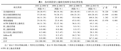 本研究结果显示:1993至2013年间我院住院患者肾上腺无功能性病变在总体肾上腺病变中所占比例最高,且呈明显上升趋势;功能性病变中原发性醛固酮增多症所占比例最高,其次为肾上腺性库欣综合征和嗜铬细胞瘤,这与国内瑞金医院刘定益等[11]报道结果相符。近10年来原发性醛固酮增多症及嗜铬细胞瘤在整体肾上腺病变中所占比重有所下降,肾上腺性库欣综合征所占比重无明显变化。分析原因如下:无功能性病变大多数为偶然发现,主要包括无功能性腺瘤、神经节细胞瘤、肾上腺囊肿、髓脂瘤、平滑肌瘤等。如前所述,以肾上腺意外瘤就诊于我院的病例数呈逐年上升趋势,而临床上大多数肾上腺意外瘤为无功能瘤。据报道,肾上腺意外瘤中良性的无功能肿瘤占82.5%[12],我院资料显示肾上腺意外瘤中无功能肿瘤占68.97%[13],意外瘤就诊病病例的增多无疑引起了无功能性病变比重的升高。相应的功能性病变比重必然会下降。与原醛症及嗜铬细胞瘤不同的是,肾上腺性库欣综合征在整体肾上腺病变中所占比重并未因整体功能性病变所占比重的下降而下降。随着对库欣综合征流行病学的深入研究,目前普遍认为库欣综合征并非一种"罕见"疾病,与普通人群相比,其在糖尿病(尤其是HbA1c>8%)、与年龄不相称的骨质疏松、高血压及肾上腺意外瘤患者中发生率明显偏高[14],临床医师对上述患者高皮质醇血症的筛查意识提高可能是库欣综合征检出率增多的原因。再者有研究报道在肾上腺意外瘤中,居于首位的功能性病变是亚临床库欣综合征,不同研究由于病例纳入标准及诊断标准不同,有关肾上腺意外瘤中亚临床库欣综合征所占比例的报道各不相同:Grumbach等[9]报道为5%,Bulow等[15]报道为2%,Libe等[16]研究结果提示为18%。以肾上腺意外瘤就诊患者的逐年增多也可能是库欣综合征比重变化的一个影响因素。肾上腺皮质癌、肾上腺转移癌、先天性肾上腺皮质增生等病种病例数较少,临床上仍不能忽视此类患者的诊治。